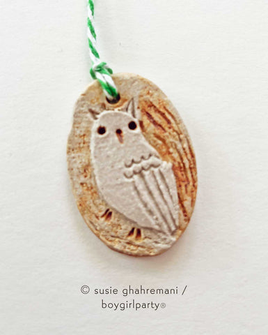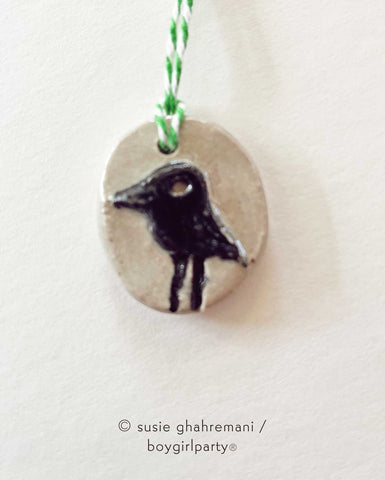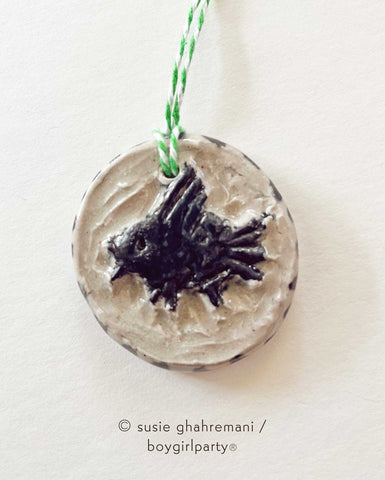 These ornaments are one-of-a-kind, made of high-fire clay and engobe. Handmade by Susie Ghahremani using the sgraffito technique. They look a bit like linocuts. Some are glossy, some are matte, as indicated. All are between 1-2" wide and signed on the reverse.