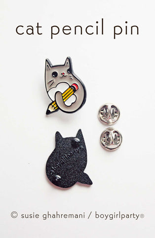 This pin for cat (or pencil!) lovers is illustrated by me (Susie Ghahremani)! Made of black-tinted metal and enamel, measuring about 1.25” tall, 0.75” wide. Wear it on a jacket, school bag, or backpack -- or gift it to a teacher for their lanyard.